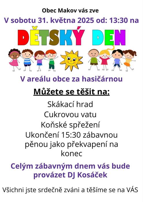 V sobotu 31. května v areálu za hasičárnou proběhne od 13:30 Dětský den. Můžete se těšit na spoustu atrakcí za hudebního doprovodu DJ Kosáčka. Všichni jste srdečně zváni a těšíme se na Vás.