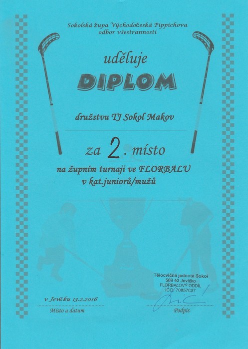 Muži se zúčastnili 13.2.2016 Župního turnaje ve florbalu tentokrát v Jevíčku. Letos obsadili vynikající 2. místo a Lukáš Poslušný byl vyhodnocen jako nejlepší brankář celého turnaje.